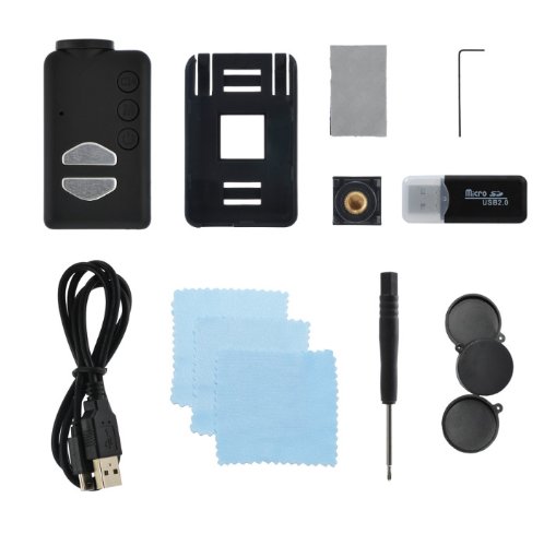 The Standard Edition by Novotm includes the following: Mobius ActionCam HD Camera, USB 2.0 micro SD memory card reader (supports up to 32GB), mounting sleeve with 1/4″-20 nut, USB data/charging cable, Velcro strip, hex wrench, screwdriver, 3 lens caps, and three lens cleaning cloths.