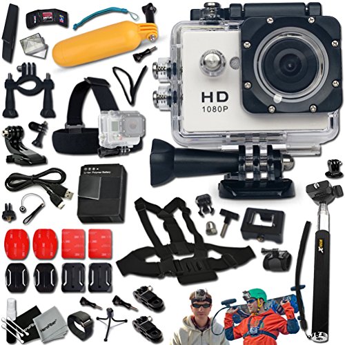 KoolCam AC200 Waterproof ACTION Camera / Camcorder HD 1080p + COMPLETE Accessories Kit Includes: Head Strap + Chest Strap + Helmet Mount + Camera Wrist Mount + Handheld Extendable MONOPOD Pole + Hermetically Sealed Floating Bobber + Adjustable Bike Mount + Long Life Battery + USB Charging Cable + Remote Control Wrist Mount + External Charger + Adjustable Tripod Mount + 2 Adhesive Flat Stickers / Flat Surface Mounts + 2 Adhesive Curved Stickers / Curved Surface Mounts + an Extra Hard Waterproof Cover + Assorted Camera Mounts / Clips + Mini Table Tripod + Memory Card Wallet Holder + Screen Protectors + Lens Cap Keeper + Deluxe Cleaning Kit + Ultra Fine HeroFiber Cleaning Cloth