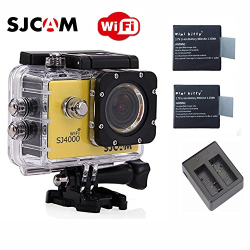 SJCAM Original SJ4000 WiFi Version Full HD 1080P 12MP Diving Bicycle Action Camera 30m Waterproof Car DVR Sports DV with Waterproof Case (Yellow)+ Free Extra 2 Mini Kitty Batteries+ Free Dual Charger