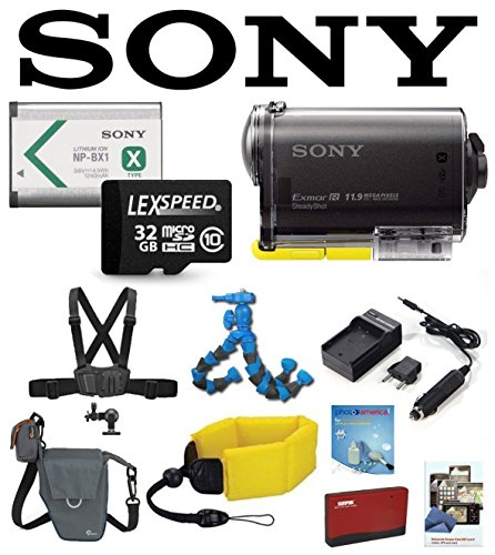 Sony HDR-AS20/B AS20 AS20/B HDRAS20/B POV Action Cam w/ Sony AKACMH1 Chest Mount Harness for Action Cam, Battery, Flexpod, LowePro Case, Floating Strap, 32GB Accessory Kit