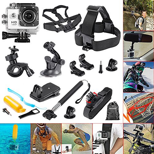 Neewer® 1080P H.264 Sports Camera with 1.5Inch LCD Display 12MP 170 Degree Wide Angle+ Full HD Lens Underwater 30m FPV Home Burglar Outdoor Sports Camera with Various Accessories + 12-In-1 Essential Kit for Gopro Hero 1 2 3 3+ 4: Selfie Monopod + Head Strap + Chest Strap + Rotating Wrist Mount + Car Suction Cup Mount + Floating Handle Grip + (2)Tripod Mount + (2)Surface J-Hook + 360 Rotary Clip Mount + Bicycle Handlebar + (2)Screw+ Wrench + Neewer Pouch