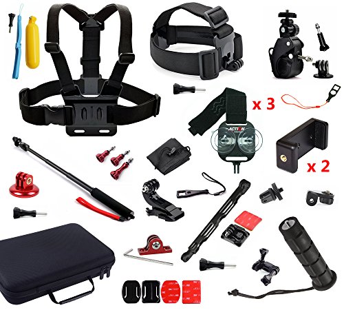 High End Ultimate 40 Piece Accessory Kit for Gopro with Action Mount® Adapters for Any Smartphone. Strongest Hold on the Market. These Mounts Work with Gopro Cameras, or Any Phone, like iPhone 5s 5 4s, Samsung Galaxy S5 S4 S3, or more. Includes Chesty, Head, Hand Grip, Helmet + Extension, Black Edition Monopod, Handlebar Mount, Hand Strap, Floaty Bobber. Includes Many Upgraded Aluminum Parts (Red).